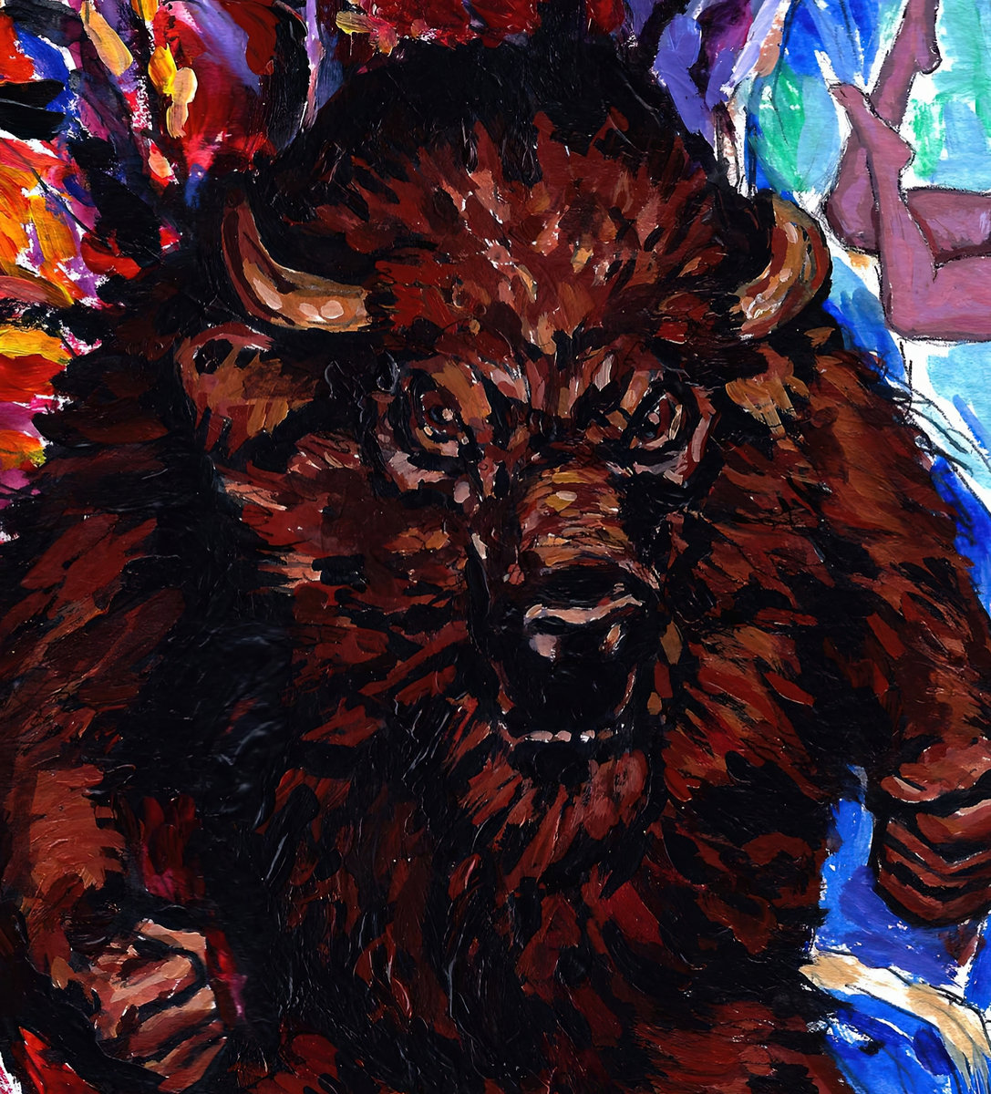 The actor voices are synthetic, by ElevenLabs. The drum is a loop. Everything else is human performance. Art by John Pierard.